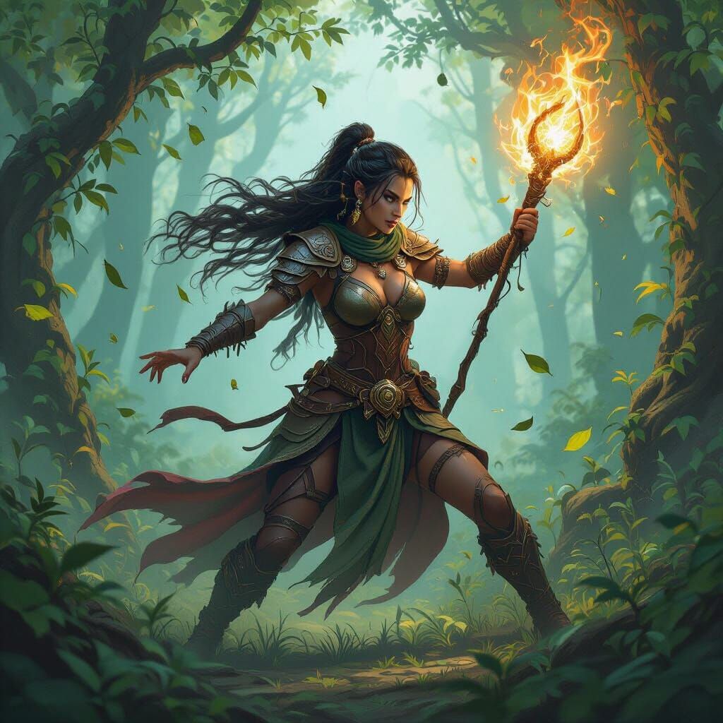 A striking picture of a female druid shaman in a mystical forest. She wears leather armor and attacks with a glowing staff, surrounded by swirling leaves. The image has a vibrant and dynamic fantasy art style.