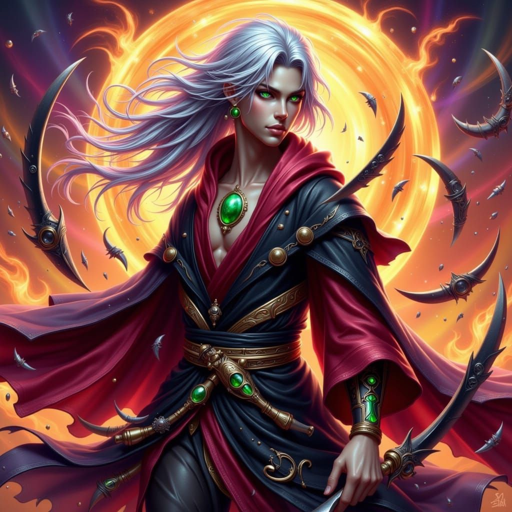 A young cultivator with striking silver hair and emerald eyes stands amidst a vibrant, gradient background, surrounded by distorted air and dark energy tendrils that seem to be seeking vengeance. Rendered in a 3D digital art style with intricate details and textures, this image captures intense energy an...