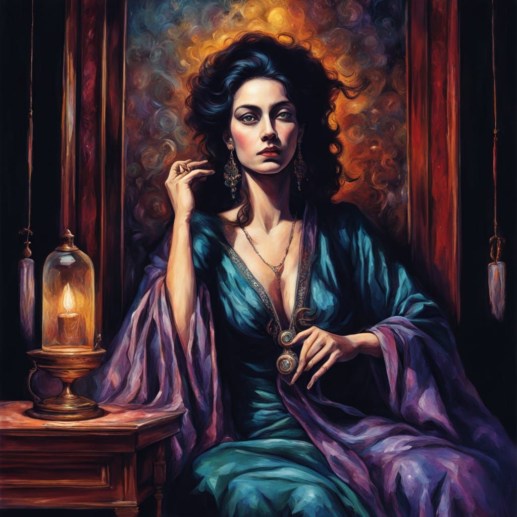 This image shows a surreal oil painting of a psychic character in medium shot, bathed in mystical chiaroscuro lighting. The artwork features intricate details and an ethereal aura, evoking a dreamlike and esoteric atmosphere.