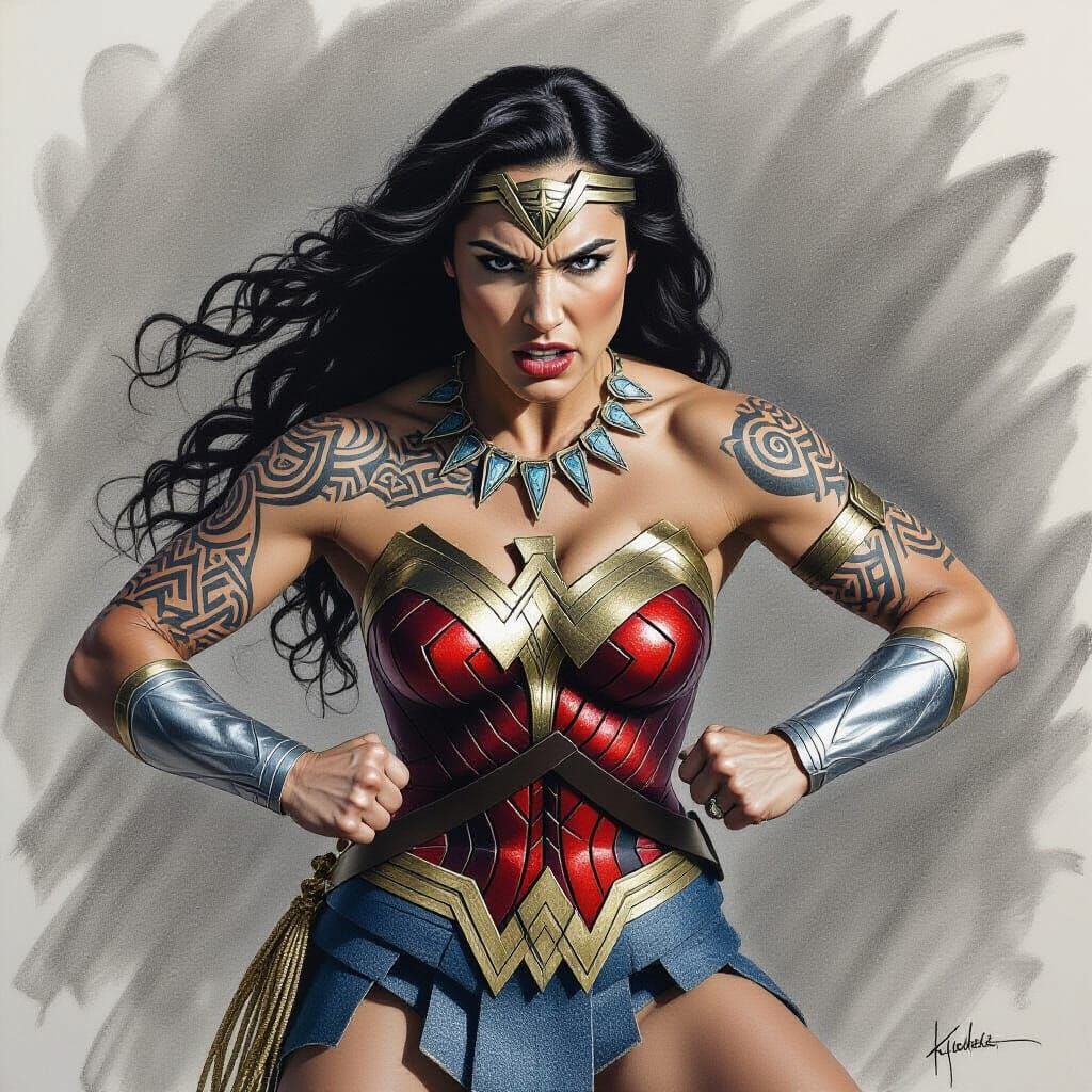 This image shows a hyperdetailed charcoal drawing of Wonder Woman performing the Haka dance with intricate Maori tribal tattoos. The artwork features dramatic lighting and dynamic lines inspired by Kollwitz and Goya.