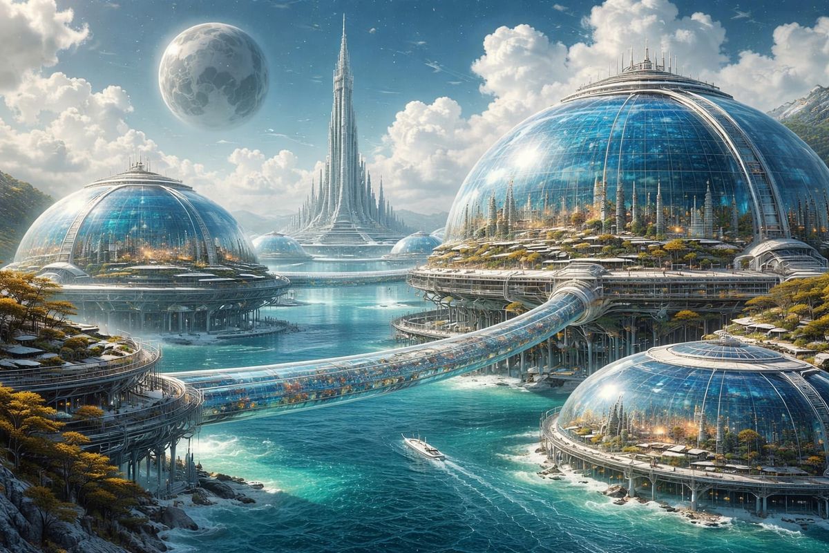 This image depicts a vibrant offworld colony on a large water planet, featuring giant domes, connected cities, and a spaceport tower, in a retro-futuristic and industrial sci-fi style.