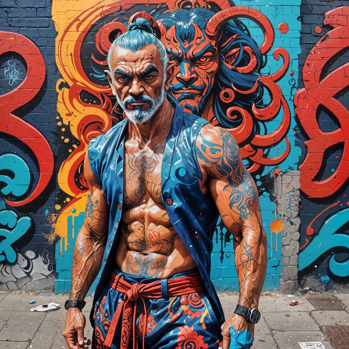 A colorful, highly detailed image of a muscular man, inspired by anime and street art styles, with vibrant blue and red colors, Arabian Nights-inspired clothing, and an ultra-realistic aesthetic.
