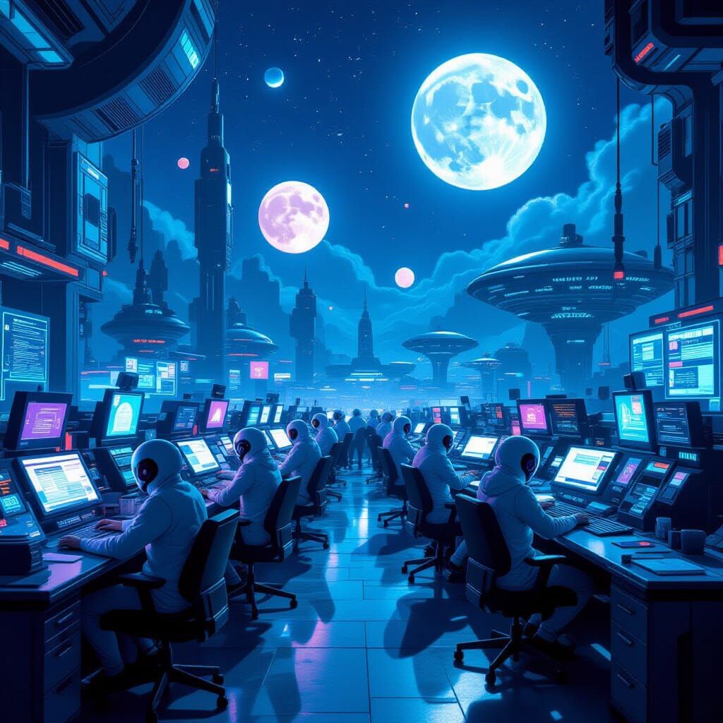 A sci-fi illustration of a busy alien call center with diverse species using holographic devices, illuminated by twin moons and neon colors.