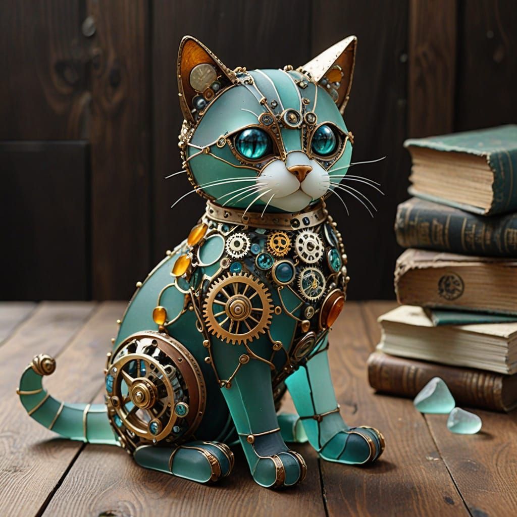 This image showcases a detailed steampunk cat sculpture made of polished sea glass in amber, teal, and pearl. Soft lighting highlights its vintage mechanical design and artisanal quality.