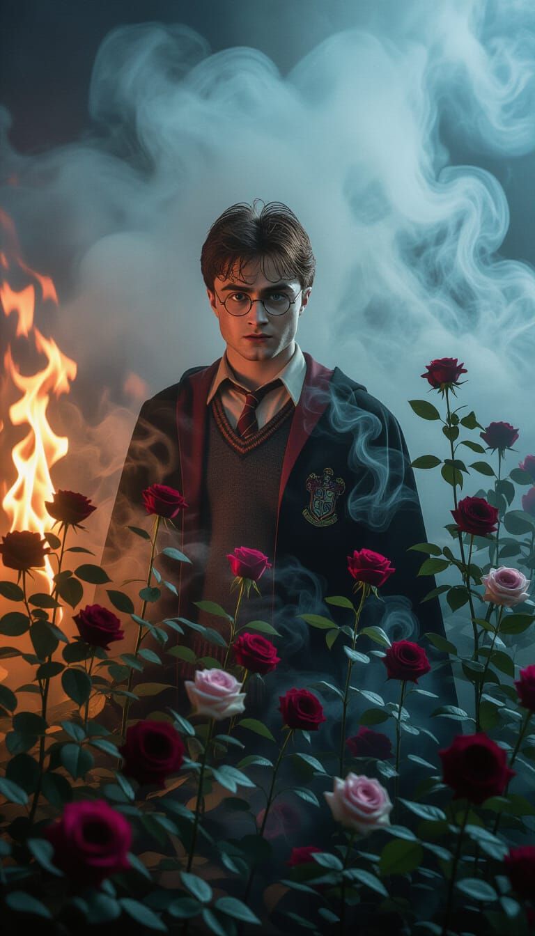 This image shows Harry Potter amid wilting roses, flames and smoke, creating a haunting scene. The image suggests dark romanticism with detailed lighting in a mist-shrouded setting.