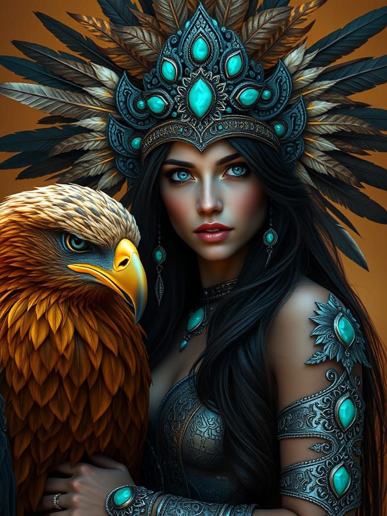 A digital fantasy art portrait of a woman with striking turquoise eyes wearing an ornate feathered headdress adorned with turquoise gemstones and intricate metalwork. The headdress features detailed eagle feathers and decorative elements in metallic silver and turquoise colors. The subject has long dark ...