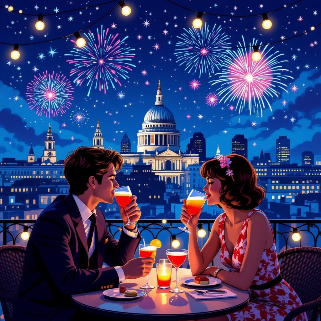 A vibrant image of young adults in mod 1960s fashion enjoying cocktails on a rooftop. Fireworks light up the night sky above London's St. Paul's Cathedral, creating a dreamy and intimate atmosphere.