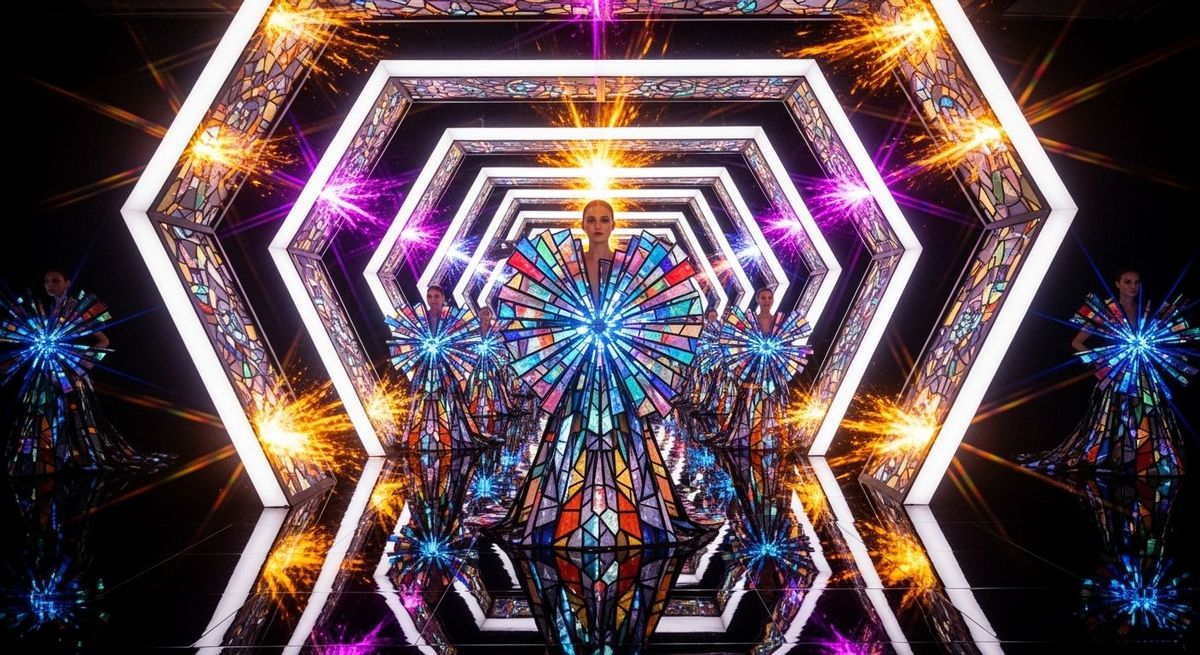 A radiant fashion show scene features a model in a stained glass gown. The image captures intense light and crystalline effects, with vivid colors creating a surreal, high-energy atmosphere.