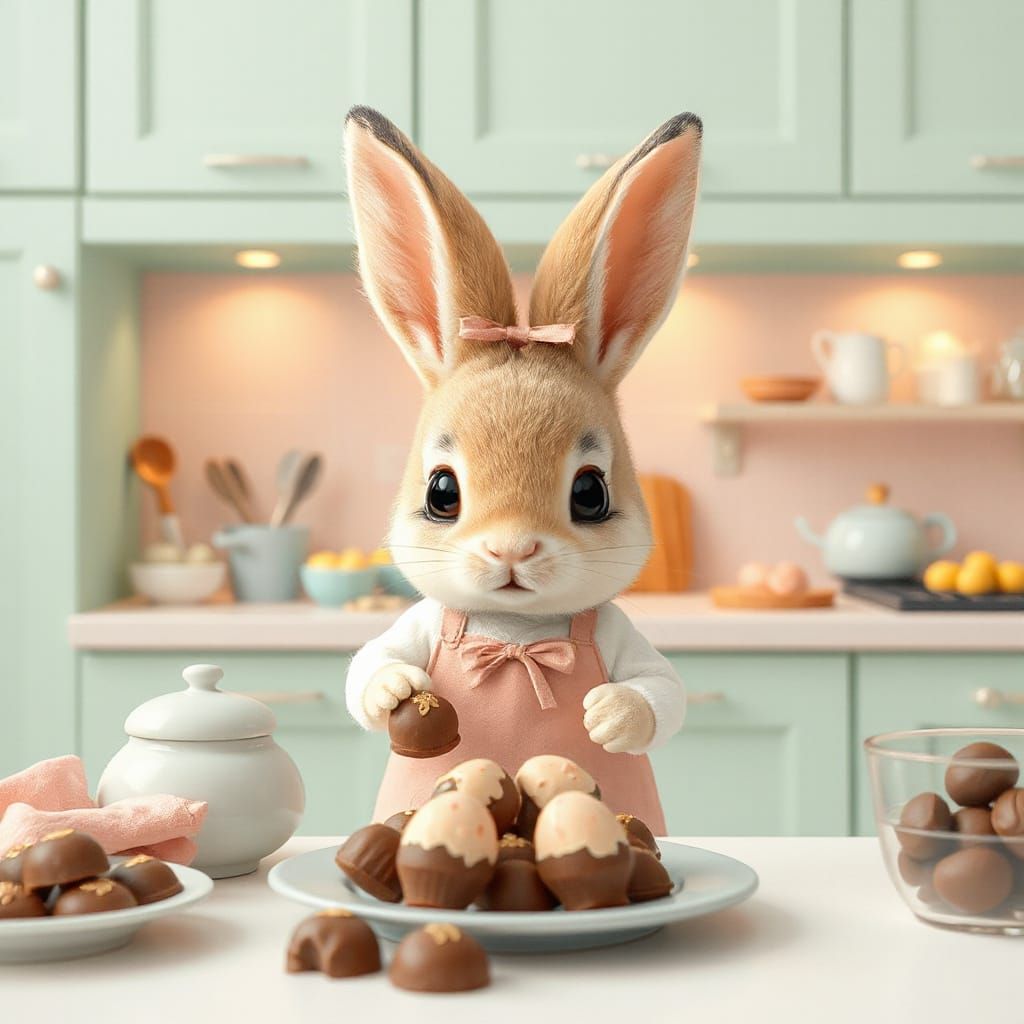 This charming image depicts a busy Easter bunny baker in a soft pastel kitchen, surrounded by colorful treats and chocolates. The storybook illustration style features clean lines, whimsical design elements, and a gouache texture.