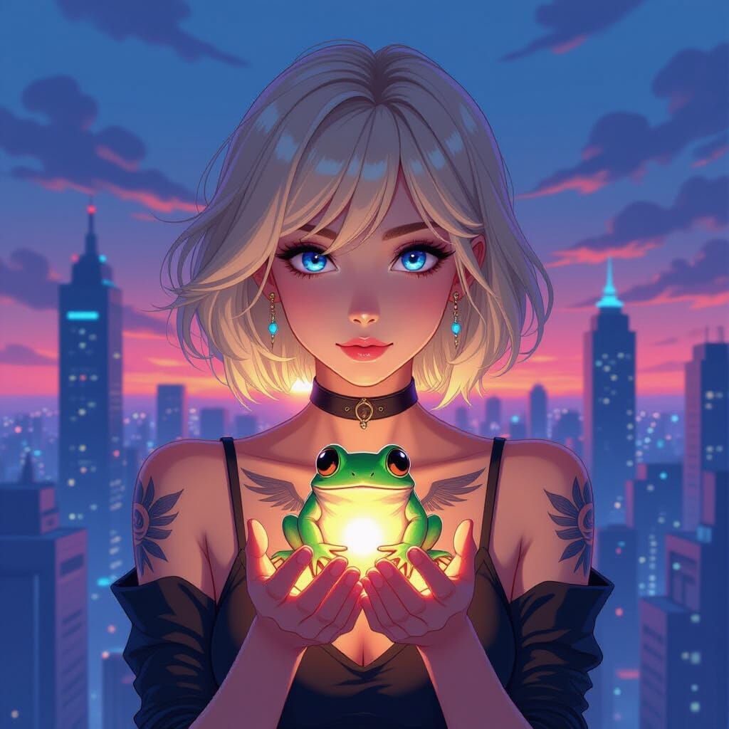 A striking picture of a young blonde woman with bioluminescent frog. Wing tattoos adorn her collarbones in a surreal manga style. The art features cel-shaded textures and crisp lines, set against a futuristic cityscape.