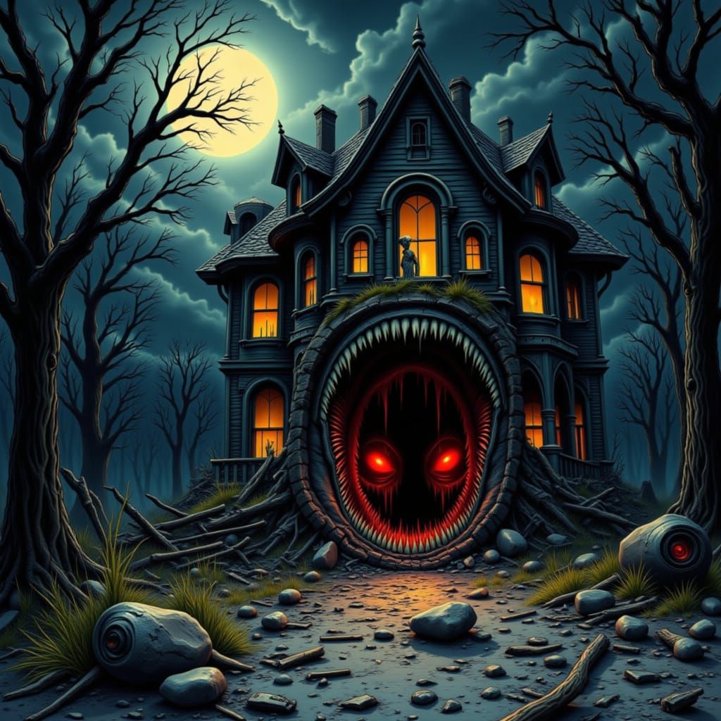 This image shows a creepy Victorian mansion at midnight, with its doorway appearing as a monstrous mouth. It features eerie moonlight, spectral fog, and dramatic lighting in a dark fantasy illustration aesthetic.