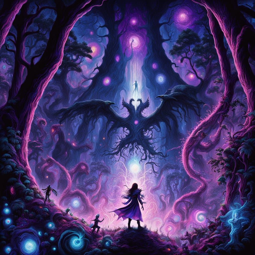 This enchanting image depicts Ciri, Yennefer, and Geralt standing strong against a mystical threat in a misty forest, surrounded by vibrant, otherworldly energies and eerie, cosmic elements, reminiscent of 80s anime and Pablo Amaringo's mixed media style.