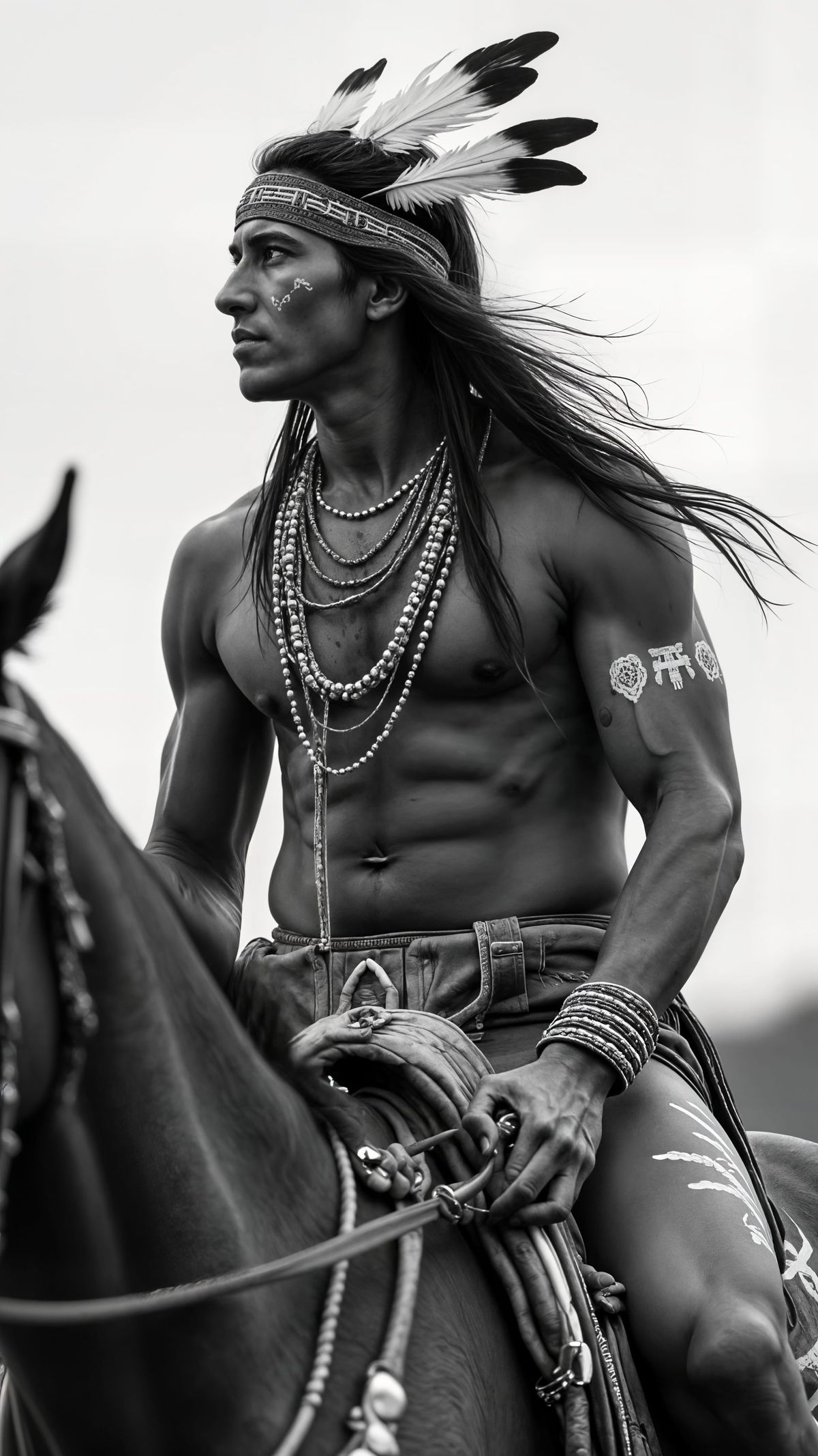 This striking image depicts a powerful Native American warrior on horseback, adorned with beaded necklaces, ceremonial feathers, and tribal symbols. The monochrome palette lends a timeless, mythic quality to this hyper-realistic portrayal, rich in cultural detail and symbolic power.