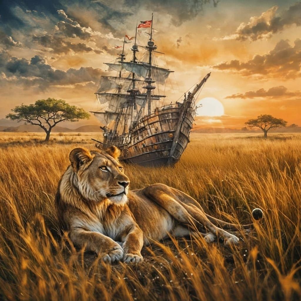 This AI-generated image artfully blends a ship and a lion into a single, cohesive scene on a savanna grassland, merging the styles and coloring of two distinct images.