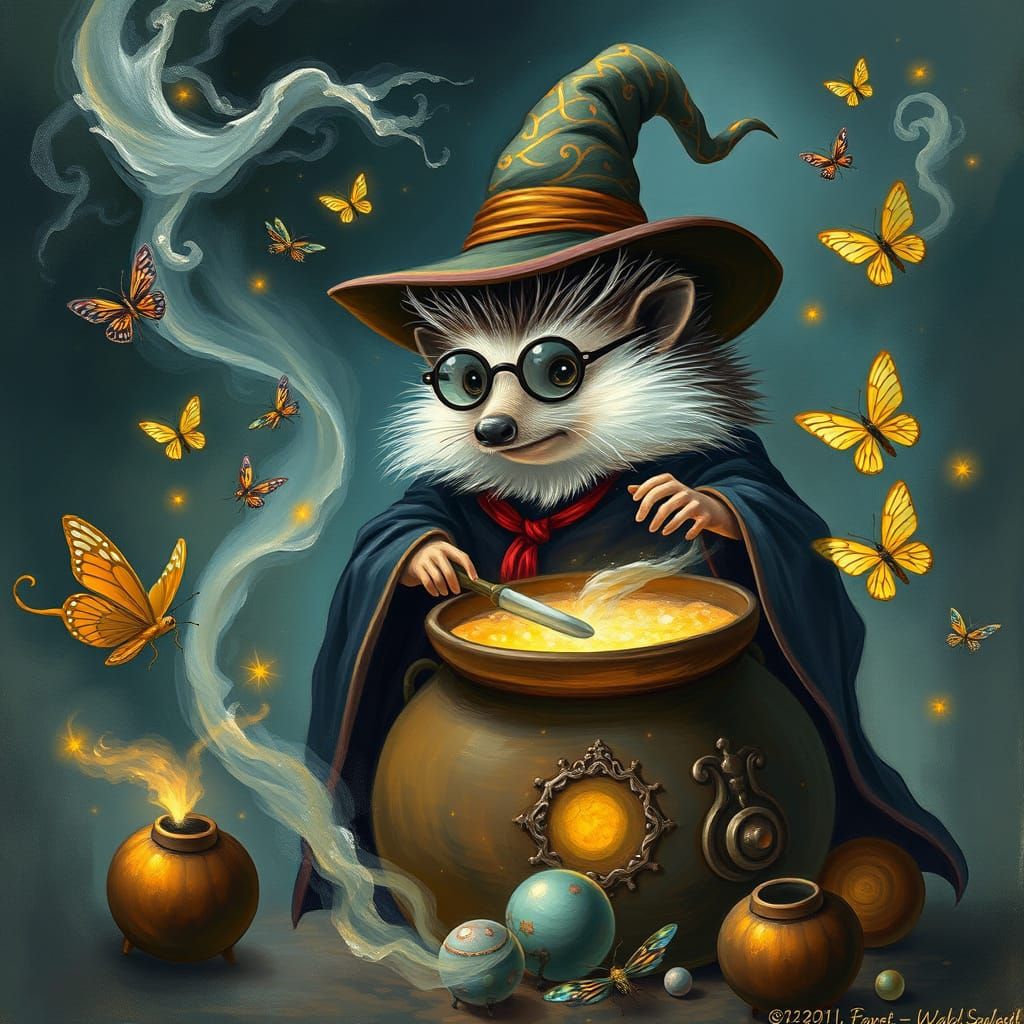 This enchanting painting depicts a hedgehog-magician brewing a magical potion in a cauldron, surrounded by glowing insects and swirling mist, evoking a sense of mystical wonder and modern art movement flair.