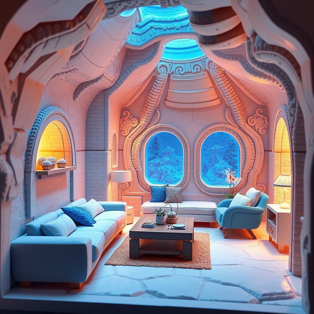 This AI-generated image depicts a unique interior space blending organic textures with advanced technology. It features crystalline structures and glowing elements, creating an ethereal yet grounded atmosphere.