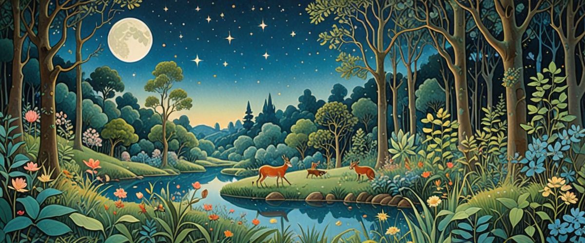 A vibrant folk art painting of a serene forest glade. The landscape features prehistoric plants and animals rendered in soft, dreamy colors under a bright, cheerful moonlit sky.