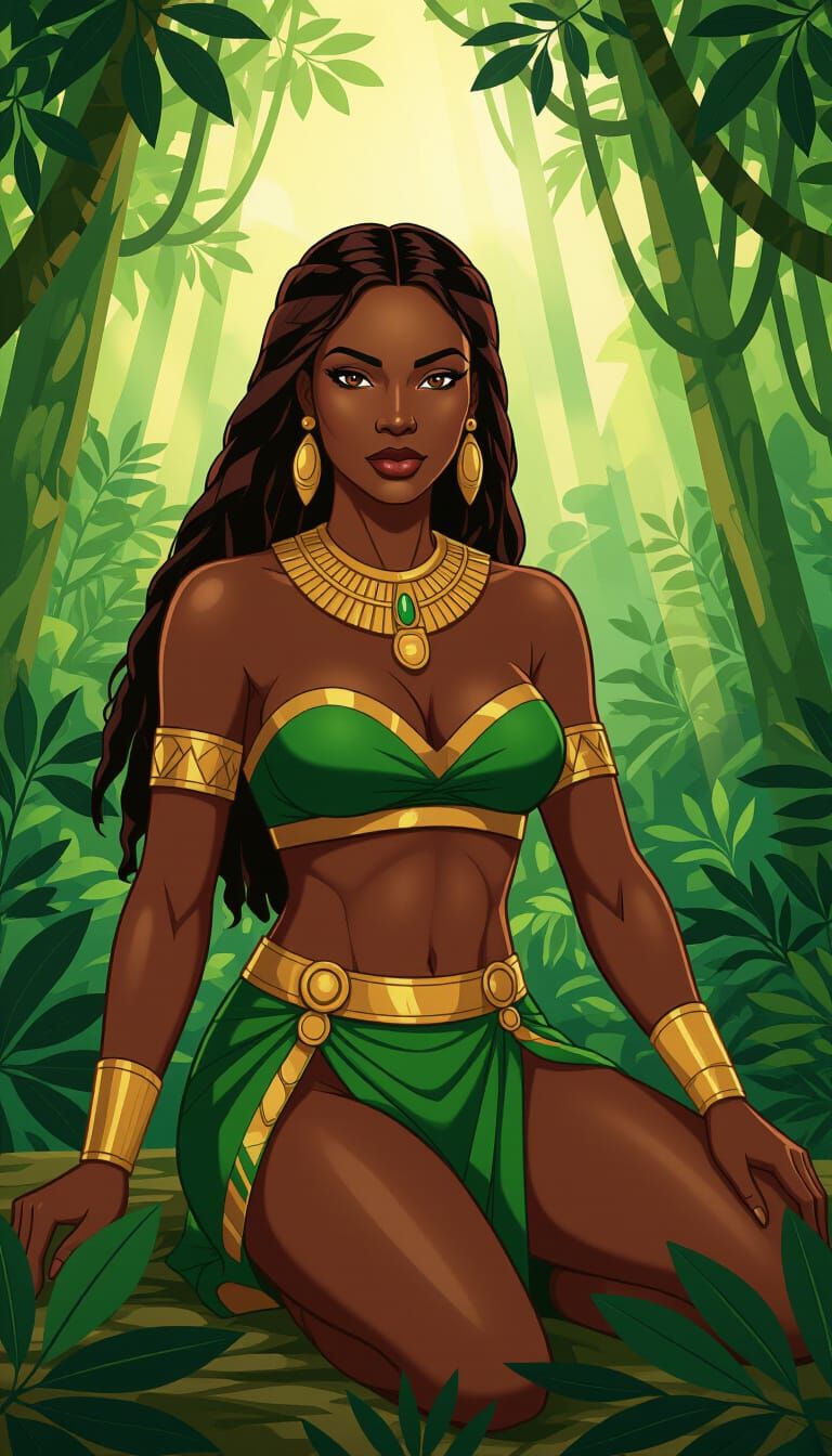 A striking picture of a confident African warrior woman seated in a forest. The digital illustration captures her power and the vibrant colors of her traditional clothing in an art deco style.