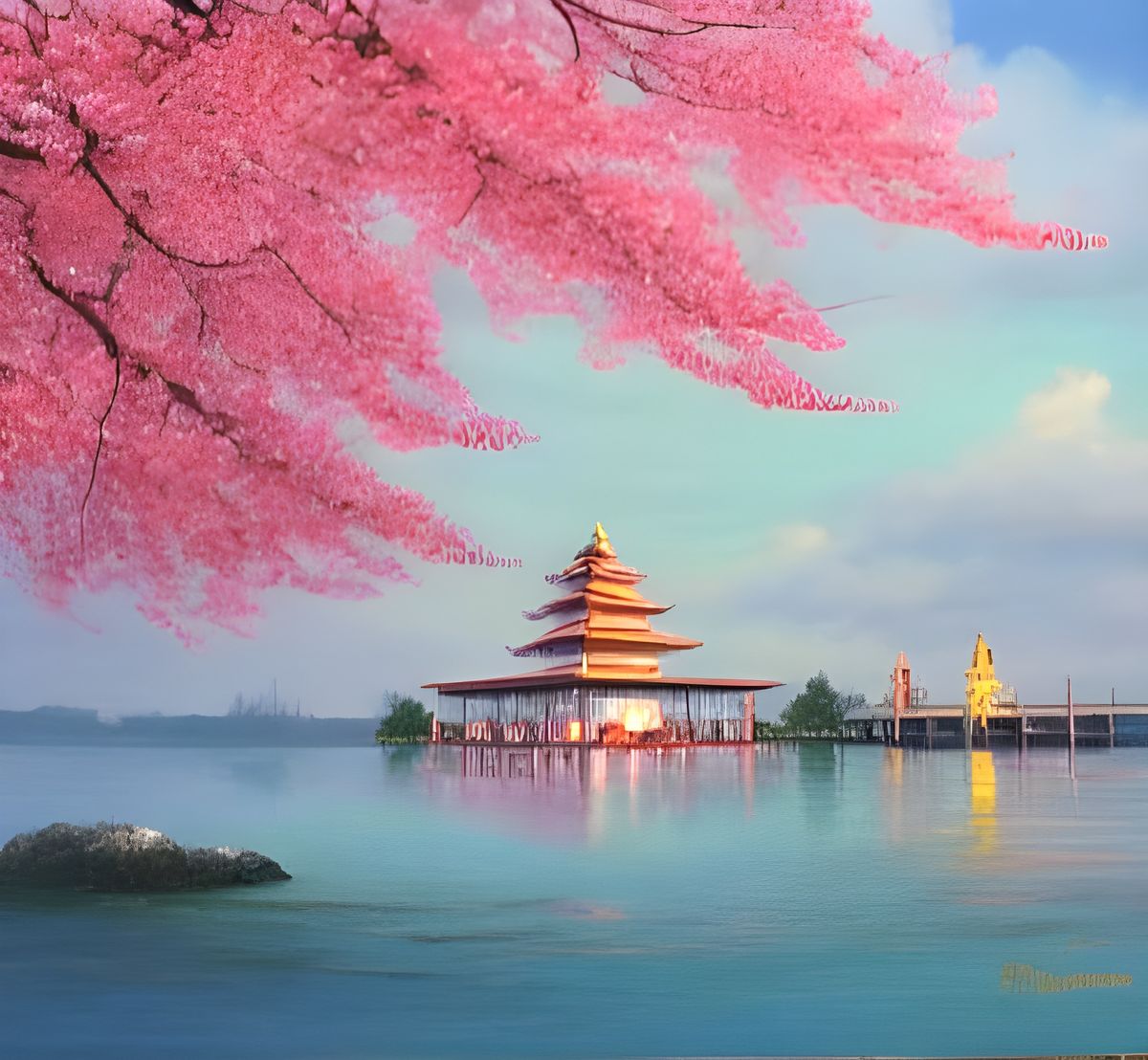 Easily generate your own romantic sunset images, featuring couples, cherry blossoms, and pagodas with our free AI tool.