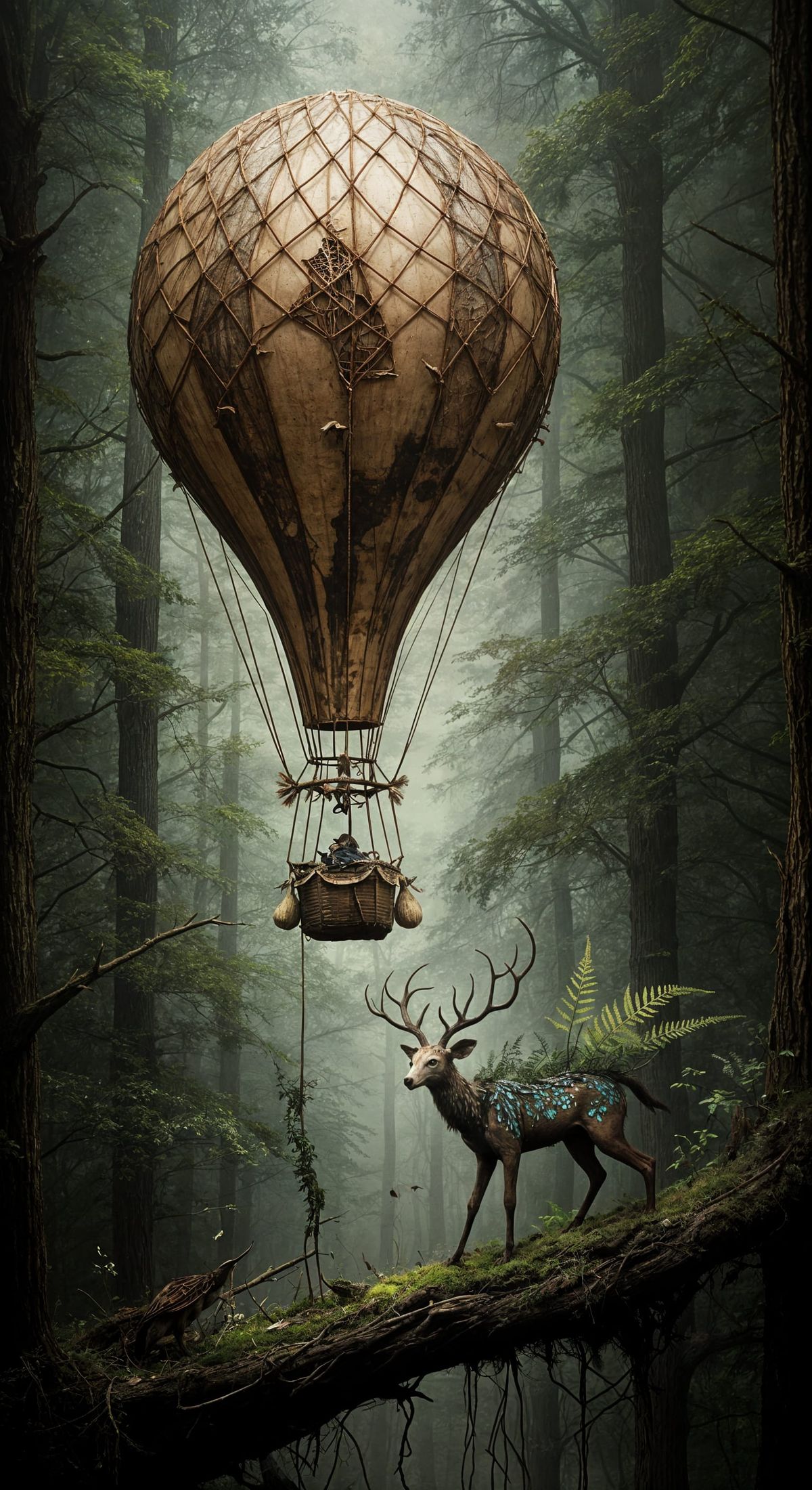 A surreal image of a dilapidated hot air balloon floating over a warped forest. The balloon is made of mixed media, and a strange creature clings to its netting. The artwork features chaotic mixed media elements.