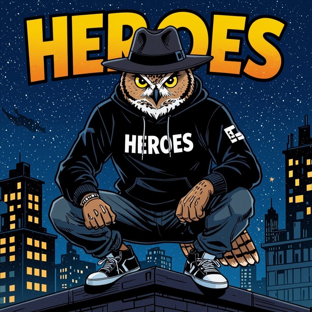 This image features a spotted owl superhero in a comic book style, dressed in hip hop attire with 'HEROES' on its hoodie. It's perched on a city rooftop at night with dynamic linework and vivid colors.