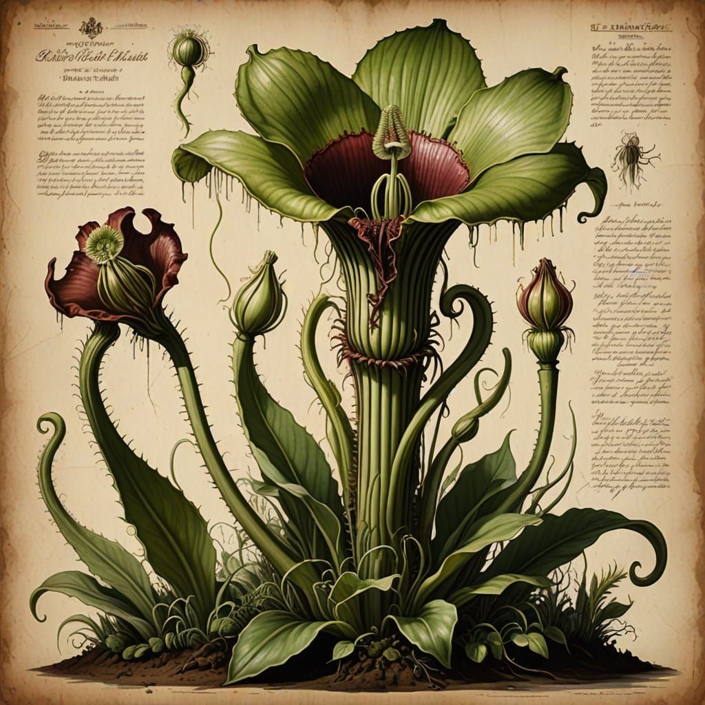A highly detailed botanical illustration of a menacing carnivorous plant, featuring a large mouth, sharp teeth, and anatomical studies on sepia-toned parchment in a vintage naturalist style.