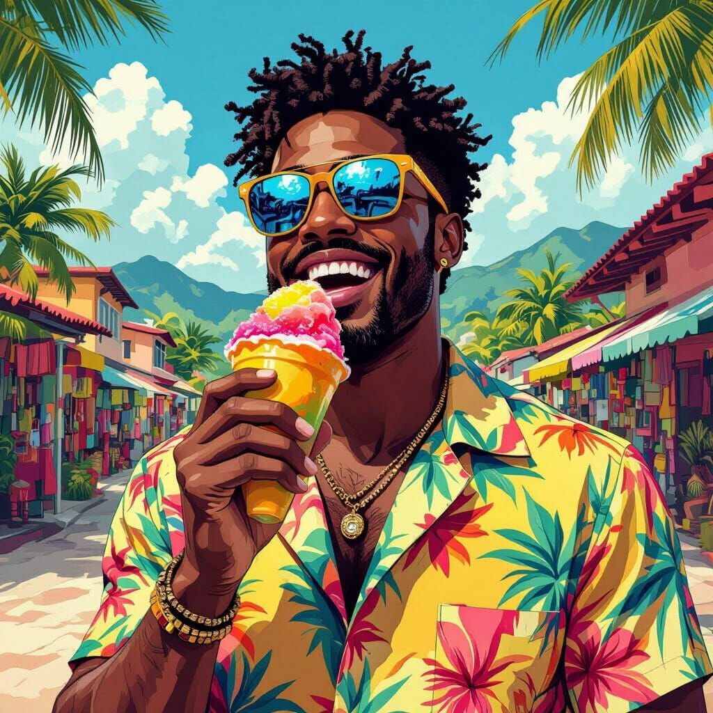 A handsome Black man enjoys a snow cone in a vibrant island village. This colorful comic-style image features bold lines, bright hues, and textured brushstrokes.