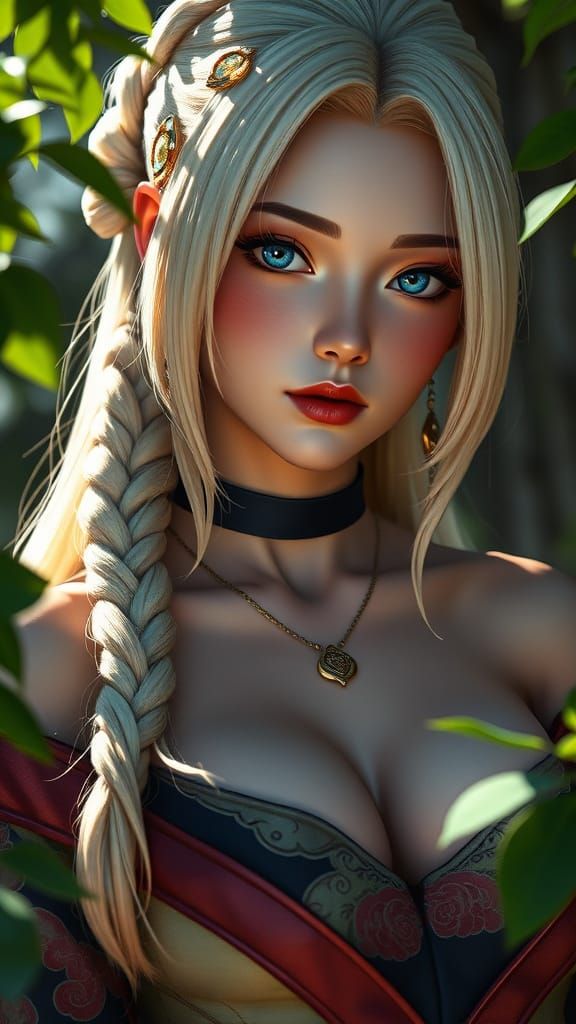A realistic portrait of Tsunade from Naruto, the Fifth Hokage, with detailed features and jewelry. She is set in a lush, natural environment, highlighted by sunlight, with a feeling of serene confidence.