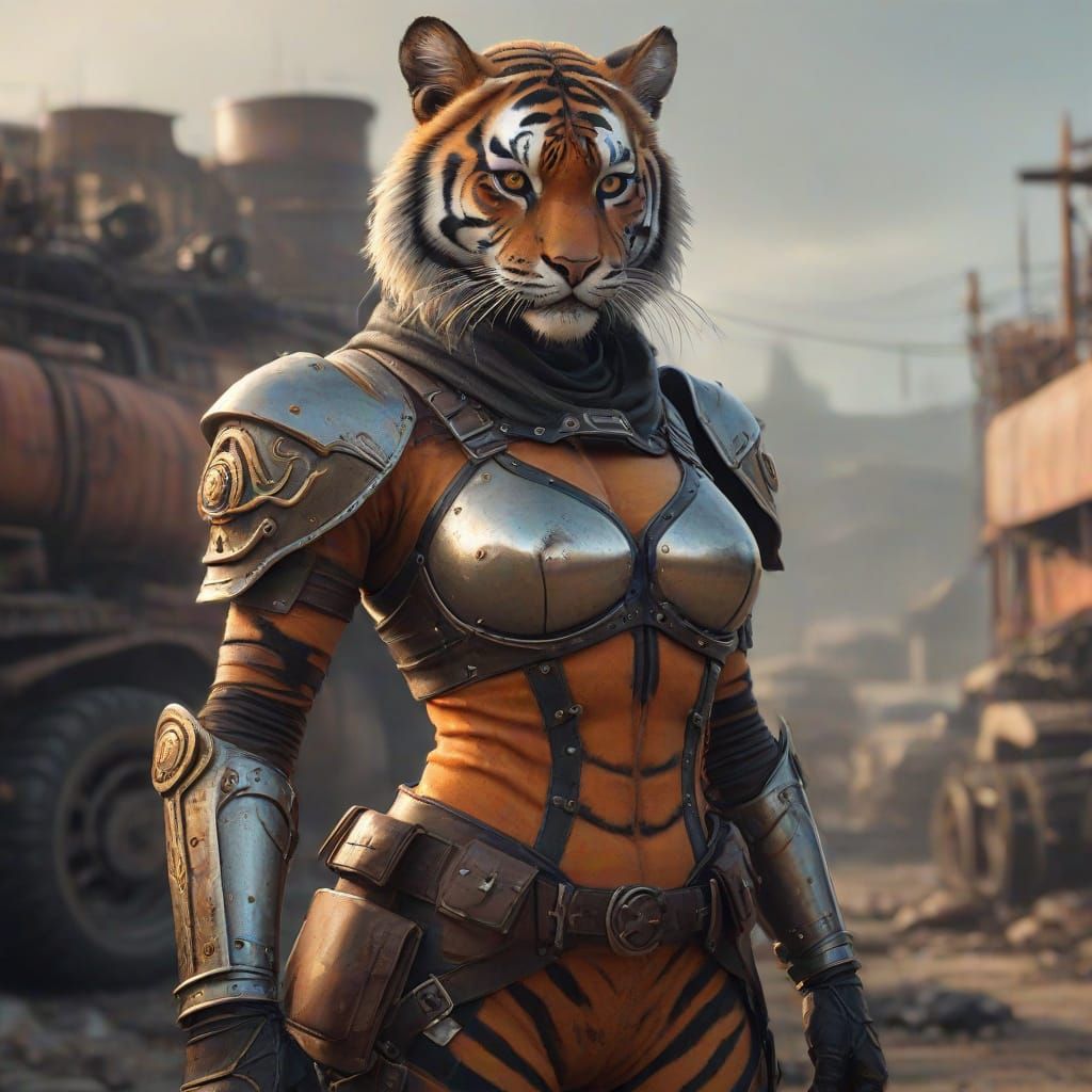 A striking picture of an anthropomorphic tiger woman in dieselpunk armor standing in a war-torn landscape. The hyper-realistic rendering showcases her powerful physique amidst crumbling ruins.