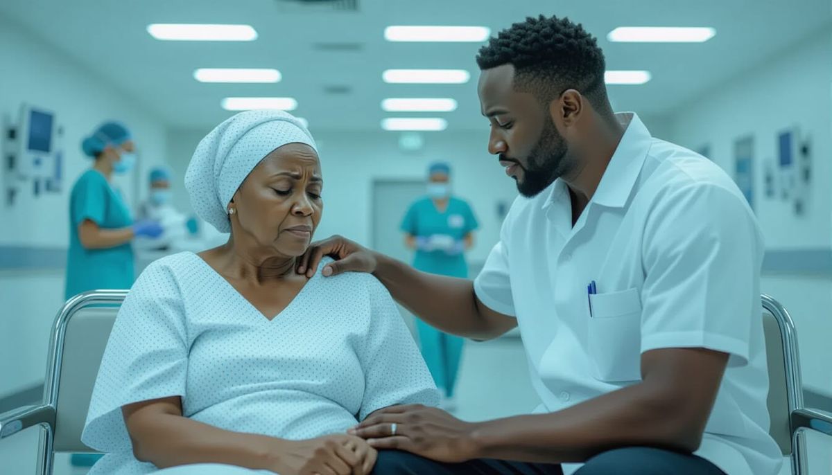 “Hospital waiting area, bright white lights, tense atmosphere. Justice, African man in mid-30s, wearing white short sleeve shirt with one pocket, sitting beside Mama Ngozi, 60, wearing plain white gown, bowing in shame, trembling and clutching her wrapper. Justice gently places his hand on her shoulder. Nurses rushing in background, machines beeping, emotional, realistic lighting, focus on their expressions and gentle interaction.”