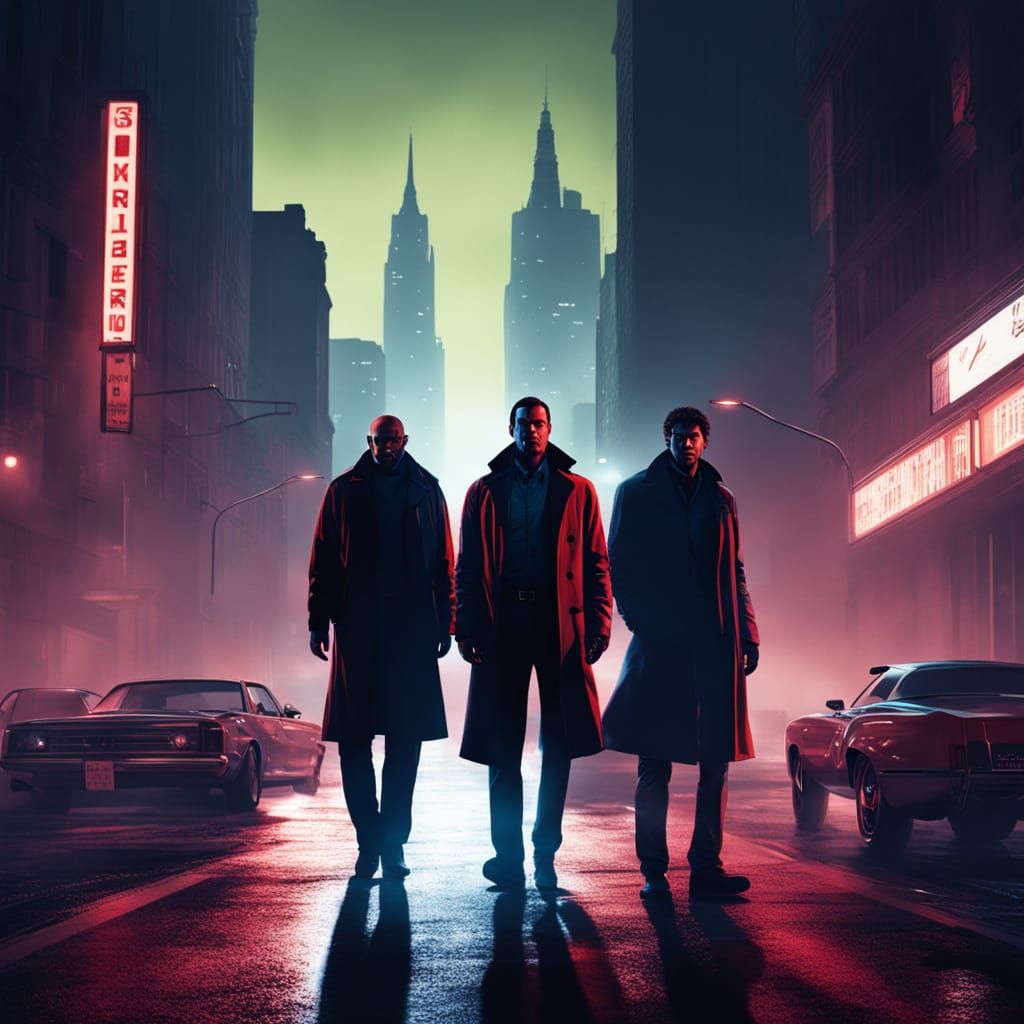 This image depicts a suspenseful book cover illustration. A mysterious woman, a man, and a hacker are featured on a city street at night, with dramatic shadows and crimson highlights creating an eerie atmosphere.