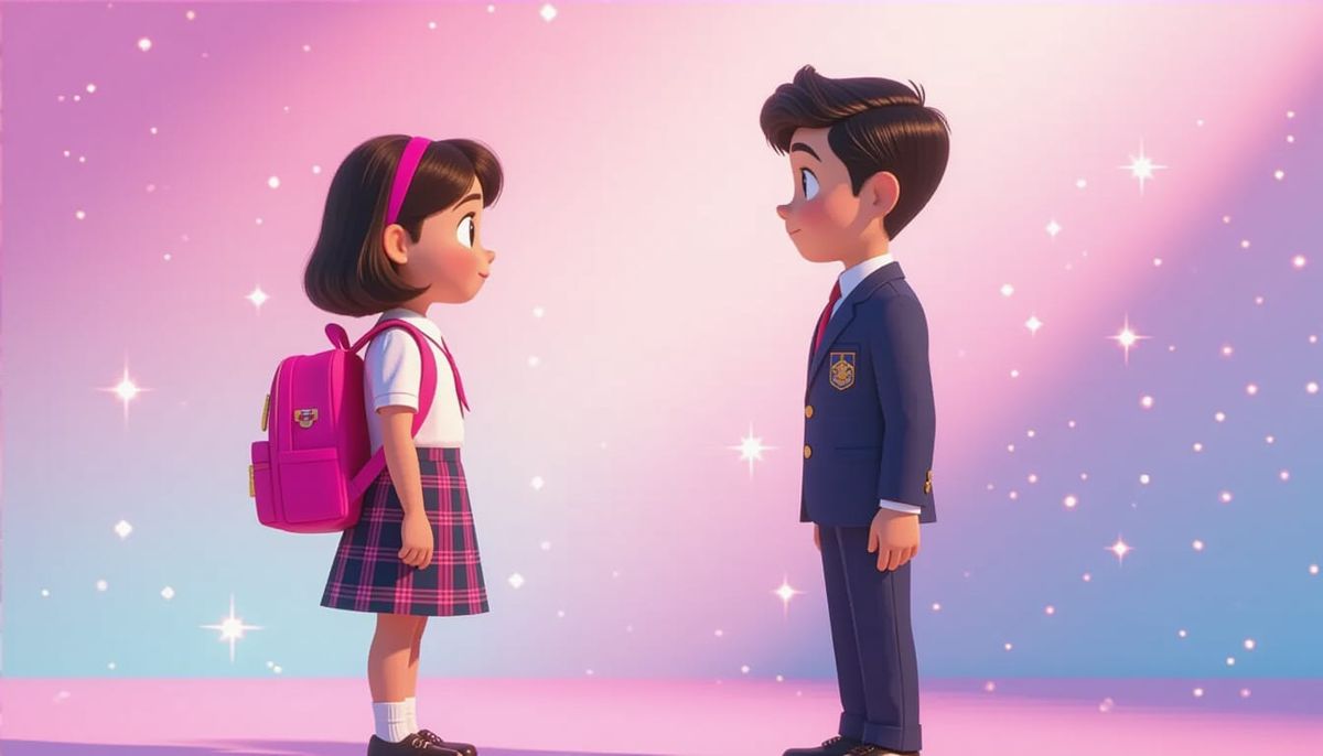 This image shows two children in school uniforms against a vibrant gradient background. The scene is rendered in a 3D animated style similar to Pixar, featuring bold lines and textured details.