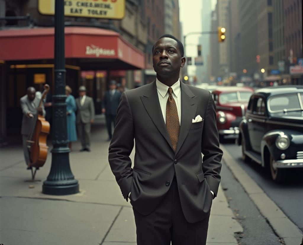 This image shows a stylish African-American man in a zoot suit on a 1940s Chicago street, complete with period cars and pedestrians. The image is presented with a classic film noir aesthetic.