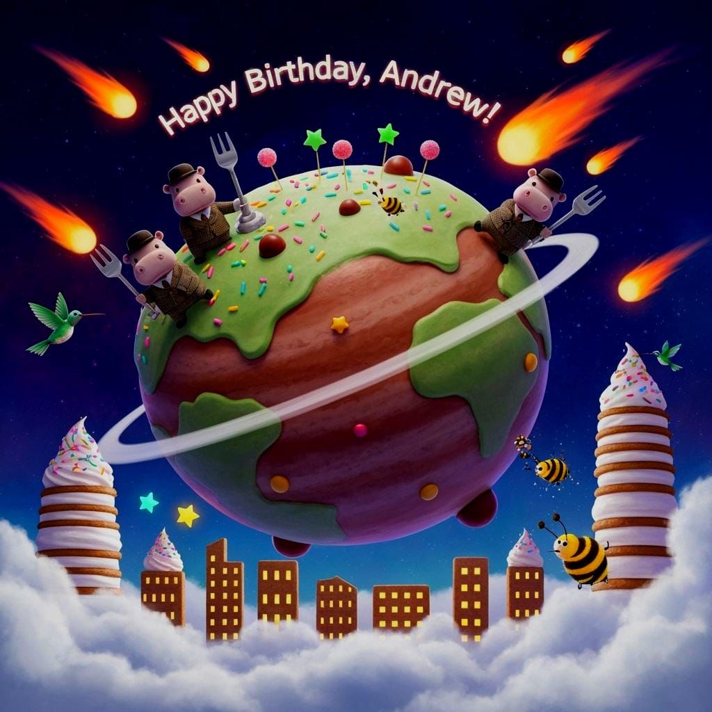 On September 12, a magical celebration unfolds in a cosmic sky. A giant floating cake shaped like a planet, sprinkled with neon candies and edible stars, carries tiny plush hippos dressed as space captains, ready for adventure. They steer the cake with tiny fork-shaped levers as chocolate meteors and glowing sugar comets streak past. Below, a cloud city of whipped cream towers and cookie skyscrapers glows warmly, while robotic hummingbirds and bees buzz around, delivering sprinkles like little parcels of magic. Floating above it all in shimmering 3D letters: โHappy Birthday, Andrew!โ, casting playful reflections across the sky. The scene captures joy, wonder, and the excitement of a birthday filled with imagination, fun, and cosmic delight.