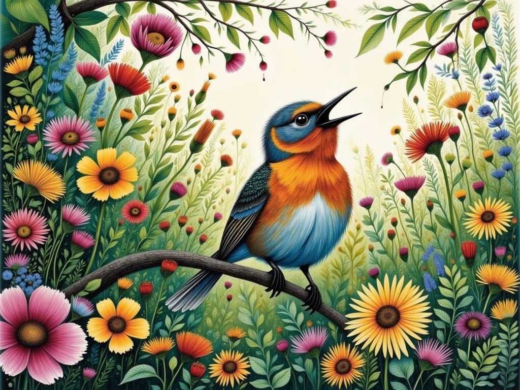This image depicts a bird singing in a lush, blooming cottage garden, characterized by intricate details and a vibrant color palette. The scene is rendered in a hyperrealistic style, with a focus on color depth and dramatic lighting.
