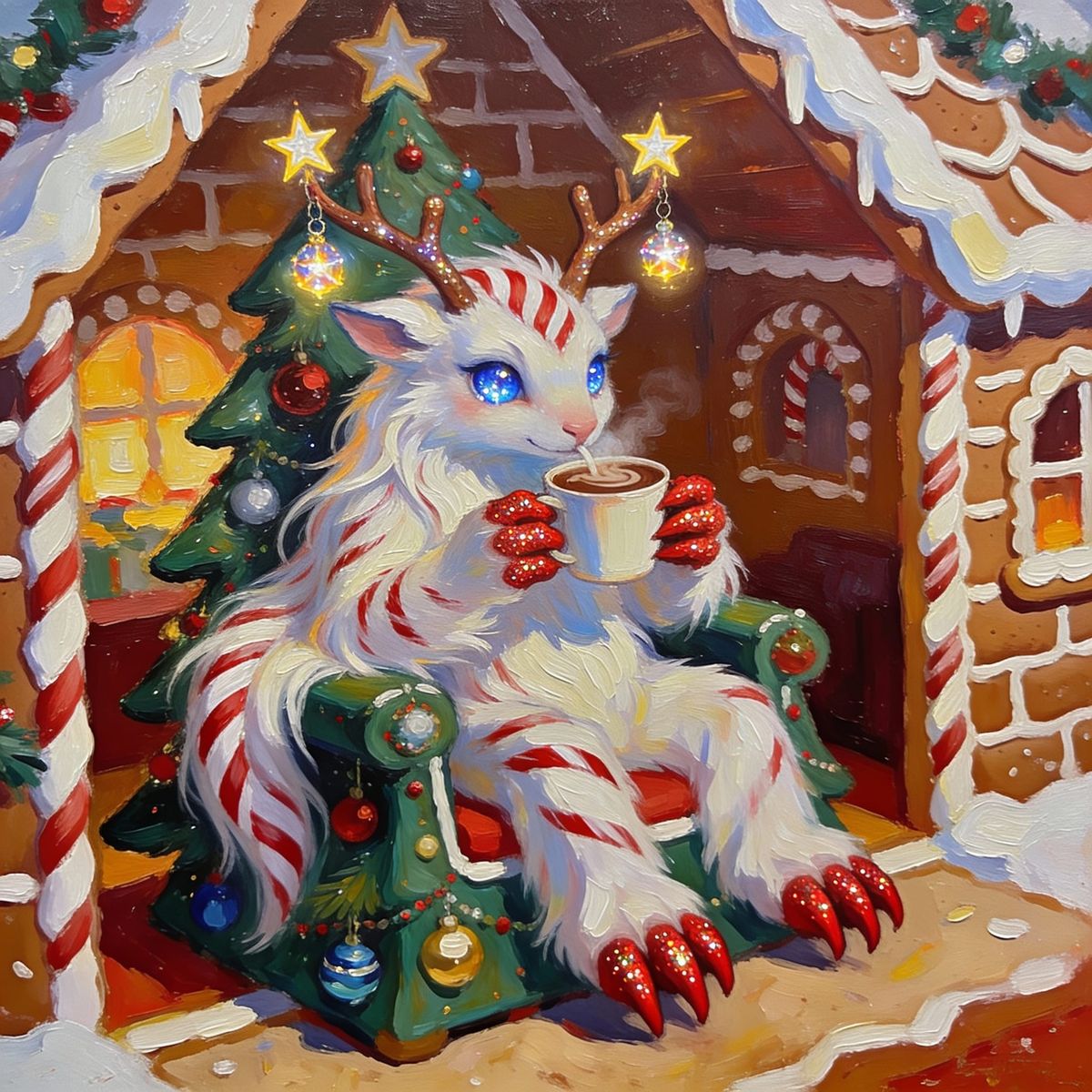 A fluffy, peppermint-striped creature with blue eyes and antlers sits on a Christmas tree throne, drinking cocoa in a gingerbread home. Painted in expressive, impasto acrylics.