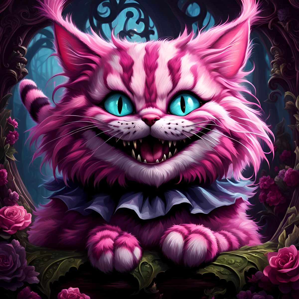 This image presents a striking representation of Alice in Wonderland's beloved Cheshire Cat, reimagined in a dramatic gothic setting with intricate details and vibrant colors, blending digital art and hyperrealistic techniques.