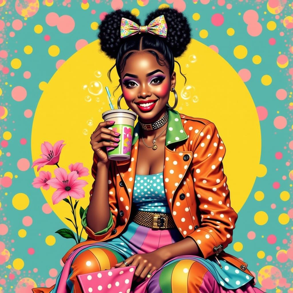 This image shows a quirky gamer girl in a vibrant, patterned outfit. The comic book style art features Ben-Day dots and bold colors, emphasizing the character's playful and unique fashion sense.
