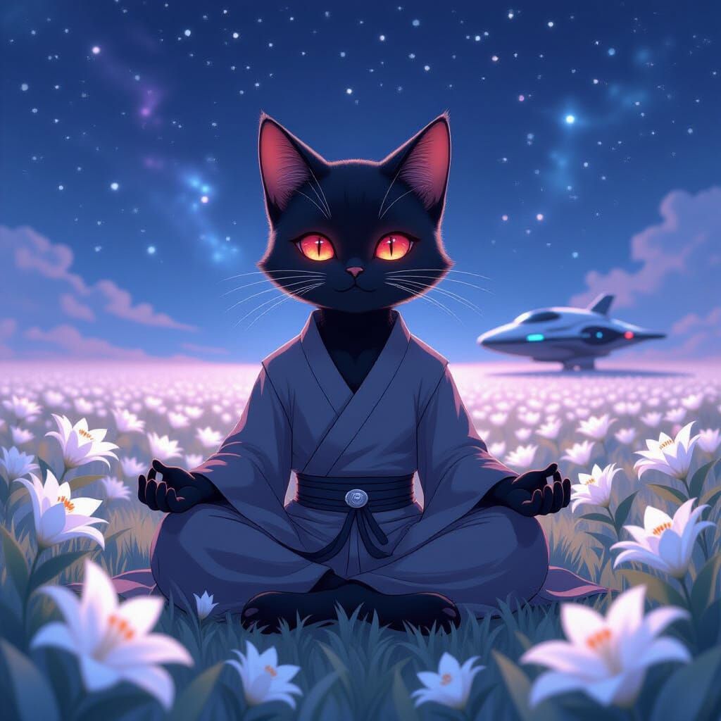 Stylized anime art, full-body low-angle hero shot. Nyxemi Rivling, illustration style, semi-realistic with soft textures. Shadowyn Riftclaw — a cute anthropomorphic male Bombay kitten with a pure self-black coat and beautiful red eyes. Wearing minimalist robes of deep grey, a single silver clasp, and ...