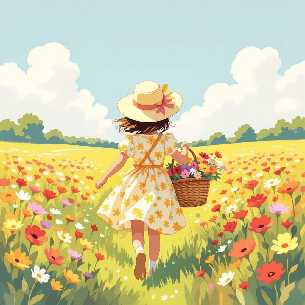 A young girl in a pastel yellow floral dress and hat explores a vast field of colorful flowers. This whimsical illustration captures a joyful scene of innocent exploration in warm sunlight.