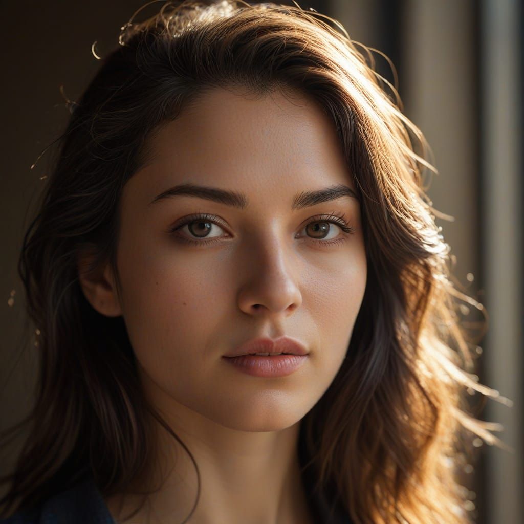 A photorealistic portrait of a woman gazing forward in a dimly lit room, illuminated by the warm glow of golden hour sunlight, highlighting her calm expression and features in exquisite detail.