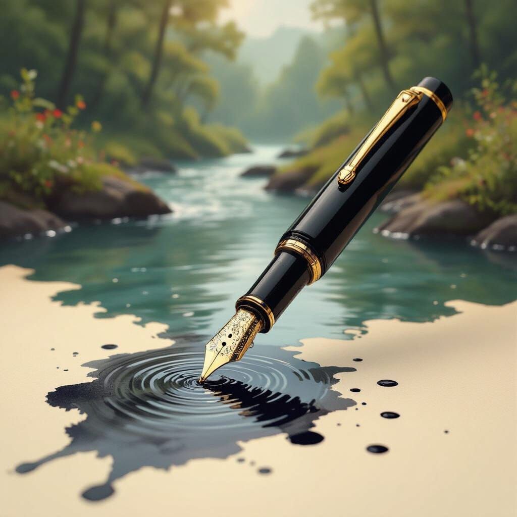 A captivating image showing a fountain pen in motion, its ink transforming into a tranquil stream. The artwork blends realism with dreamlike qualities, reminiscent of digital art.