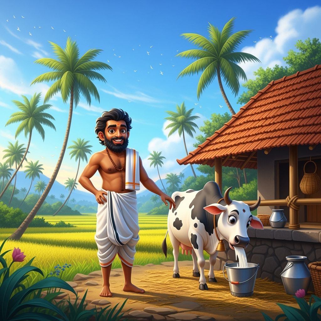 A vibrant 3D animated scene of a Kerala village shows a cheerful farmer and his cute cow in a lush, detailed setting. This fantasy concept art is rich with complementary colors.
