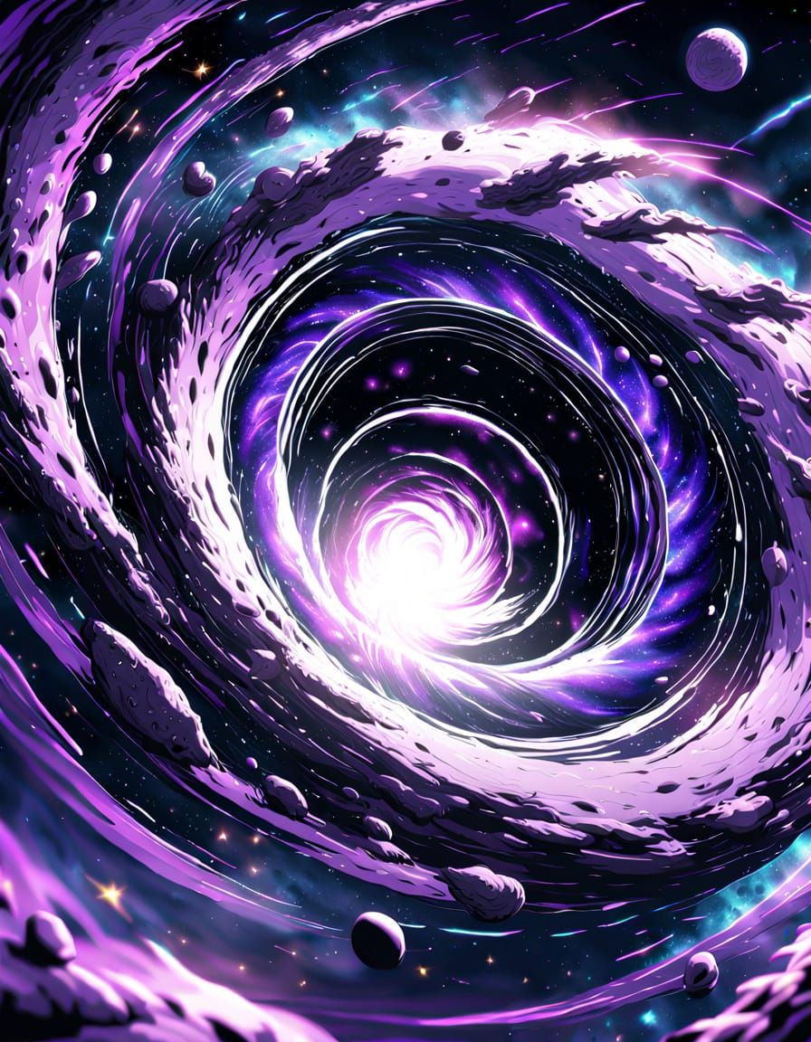 This anime illustration features a close-up of a vibrant purple blackhole, surrounded by cosmic dust and nebulae. The artwork uses a vivid purple and deep black color scheme, creating an ethereal sci-fi fantasy scene.