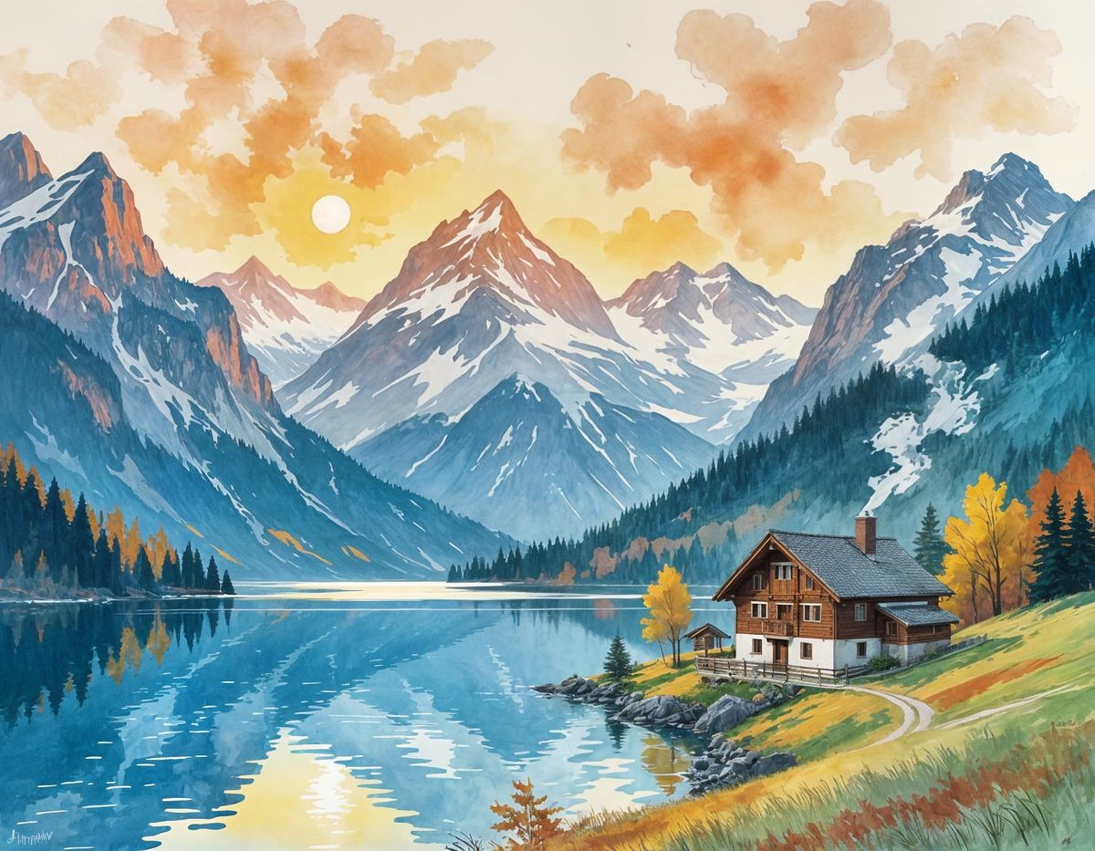 This image displays an abstract Chinese ink painting featuring a serene valley in the Swiss Alps at dawn. The artwork incorporates spirograph elements and a vibrant color palette.
