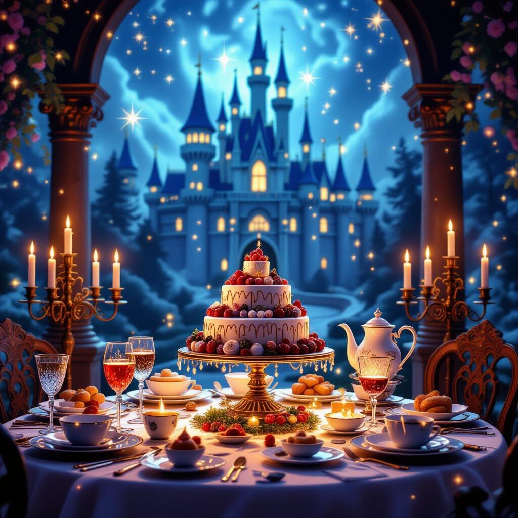 This image depicts a magical feast with glowing desserts and sparkling teapots floating in a grand castle. Illuminated by ethereal light, the scene is rich in vibrant jewel tones and gold accents.