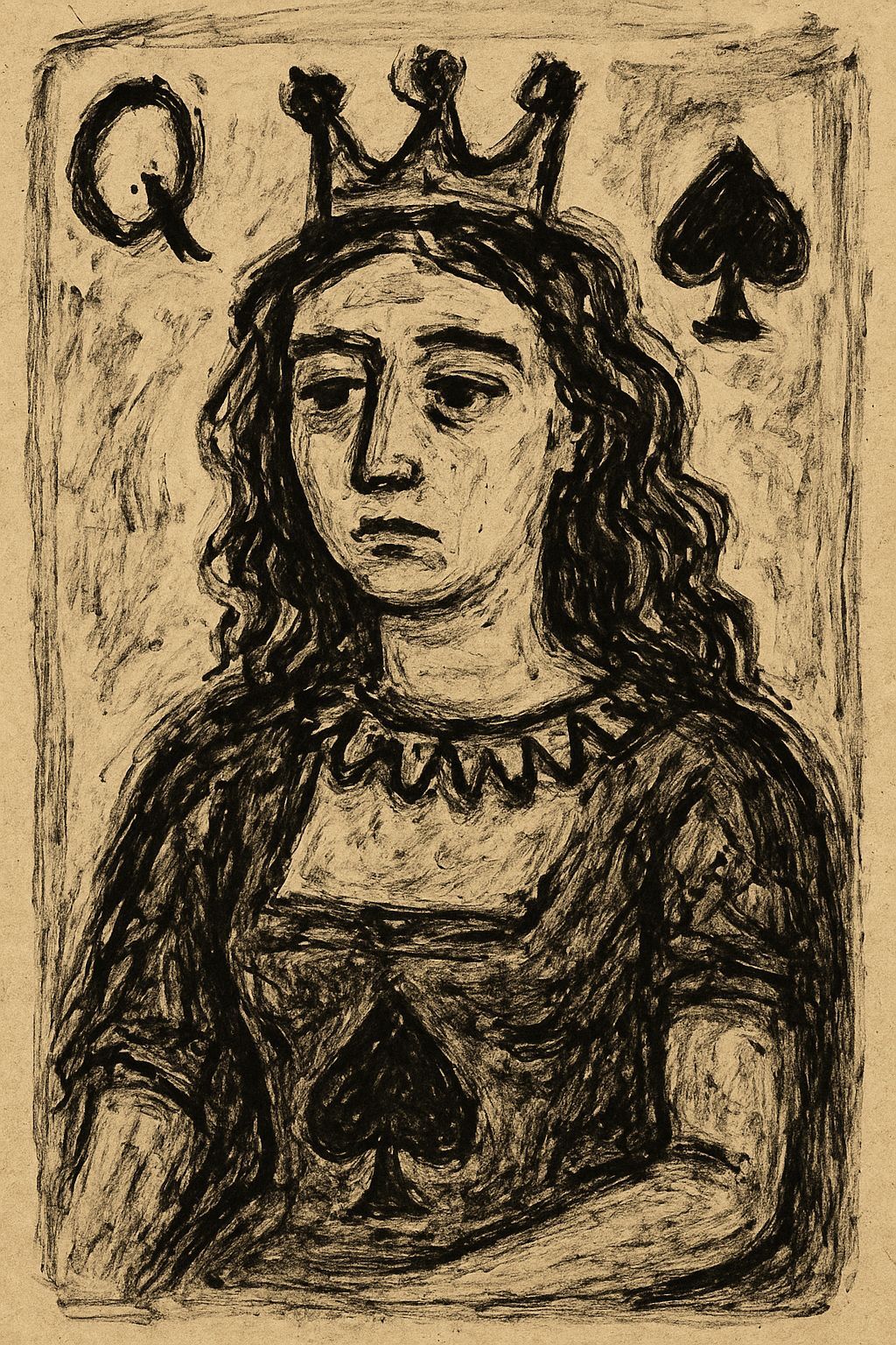 A portrait of the Queen of Spades in a poorly executed and crude style. This image is what an AI image generator created when given a simple prompt about the Queen of Spades.
