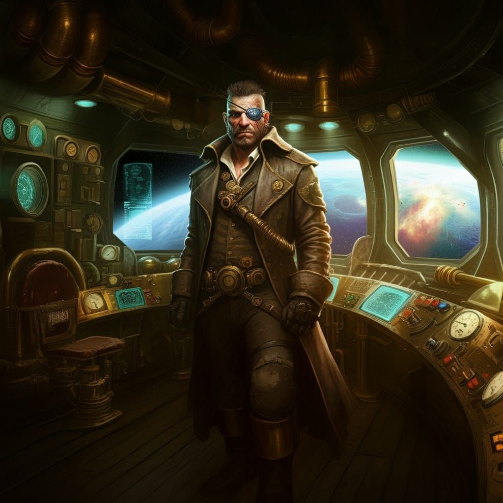 A rugged space pirate captain with a cybernetic eye and a worn leather coat, standing on the bridge of his heavily modified steampunk spaceship