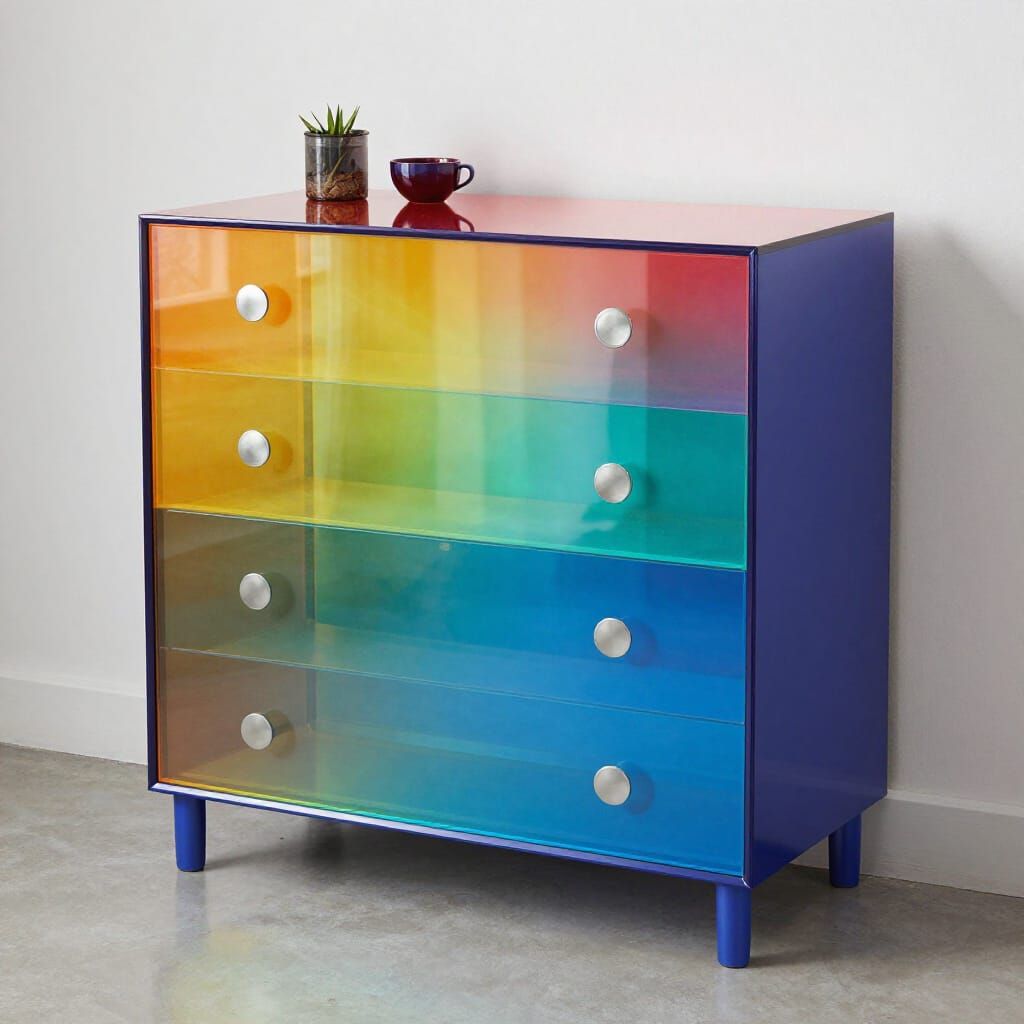 This image showcases a vibrant display of colorful prisma elements arranged on a bureau, offering a visually striking and artistic composition.
