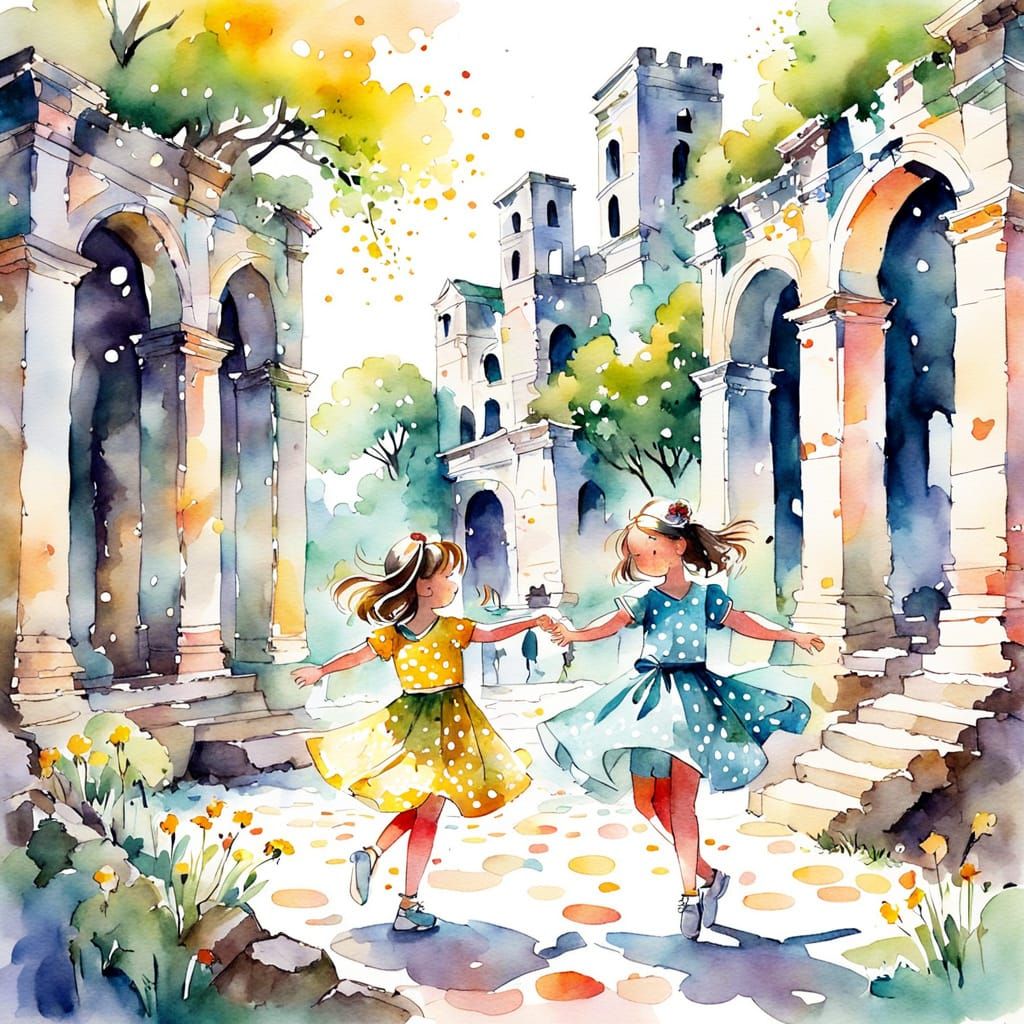 This image shows children dancing in an ancient city filled with blooming trees. The watercolor sketch uses pastel colors and playful textures to create a dreamy atmosphere.